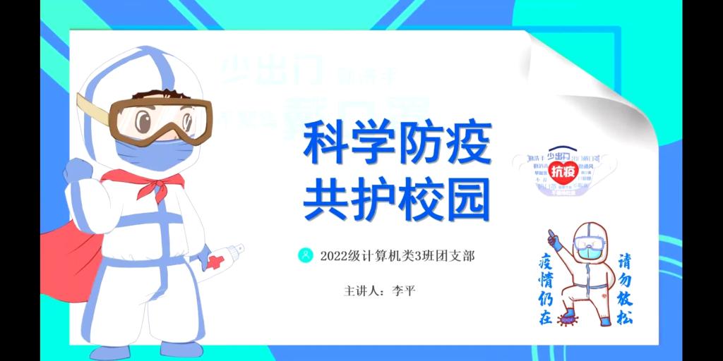 为了守住来之不易的防控成果,提升班级成员大局意识、纪律意识和防控意识,我院22级计算机类3班全体成员于2022年10月24日下午7点在线上通过腾讯会议开展“科学防疫,共护校园”主题团日活动。