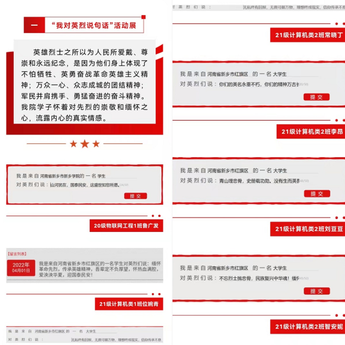 开展“网上祭英烈”活动。我院各团支部、各党支部依托网络积极开展“情寄清明 缅怀先烈”网上祭扫缅怀纪念活动。师生通过“中华英烈网”平台,浏览烈士名录,点亮“祭拜”红心,通过鲜花祭祀、丝带祭祀、书写寄语、媒体点播思念歌曲等方式来缅怀先烈、追思先人,并将自己对英烈说的话分享在班级群、支部群中。