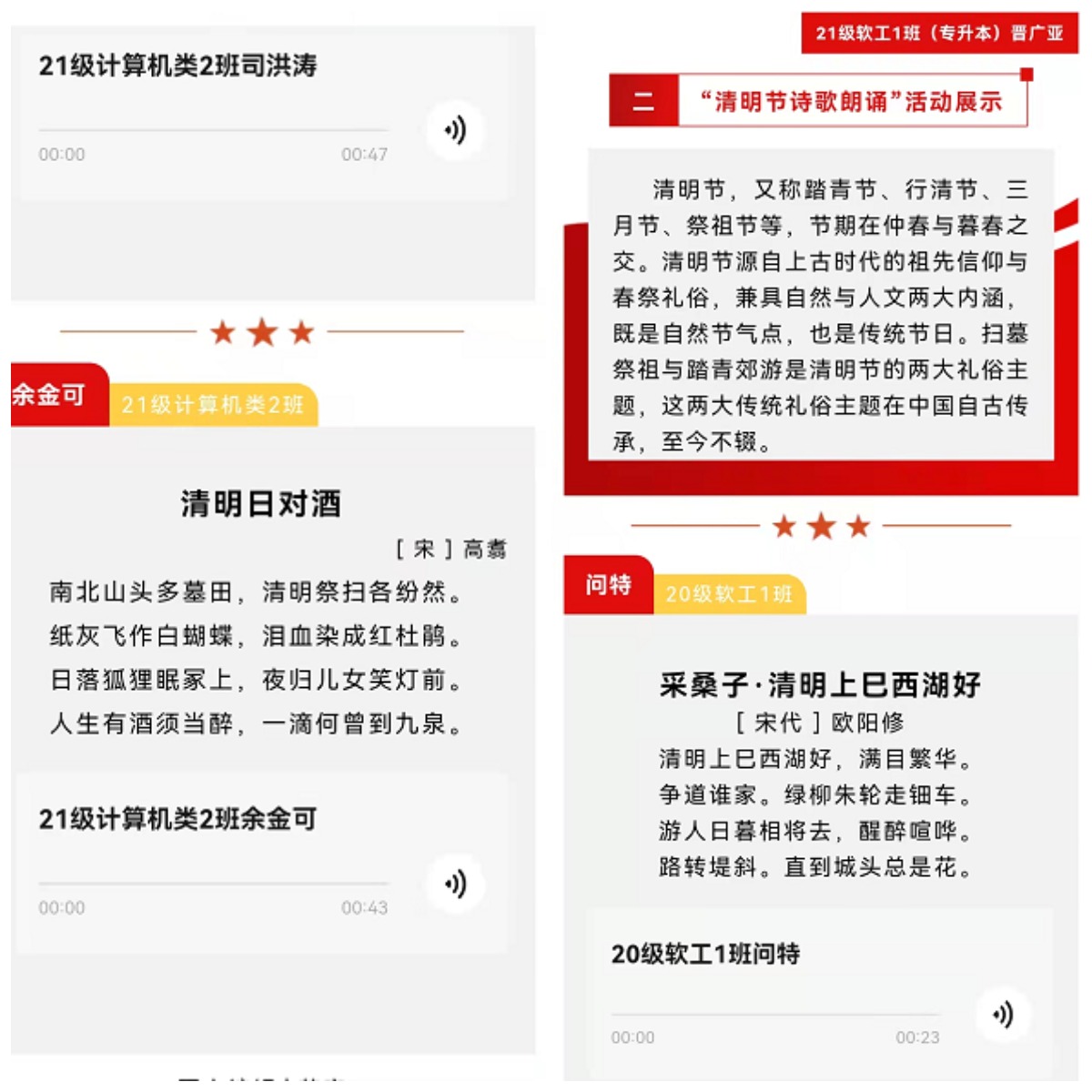 开展“清明节”线上诗词朗诵会。清明节前,我院积极发动学生,广泛开展线上清明诗词朗诵会。诗词朗诵会通过线下录制、线上征集,线下线上相结合的方式,用声音追思,用声音礼赞。清明节当天,我院选出优秀作品通过“计信青年”公众号进行展示,使广大师生在感悟经典、践行经典中感念先烈、先贤、先人,慎终追远,不忘初心,牢记使命,勇毅前行。