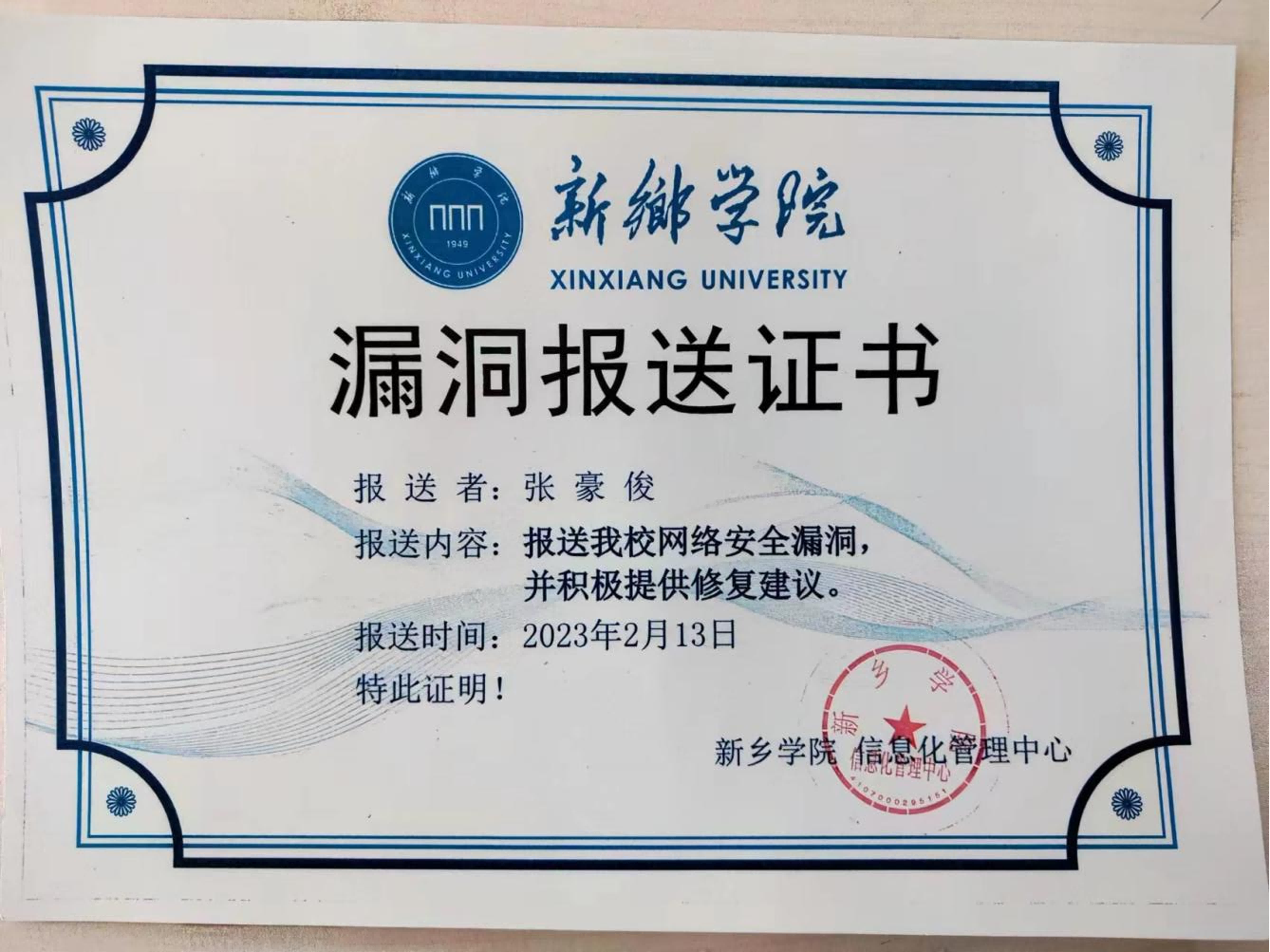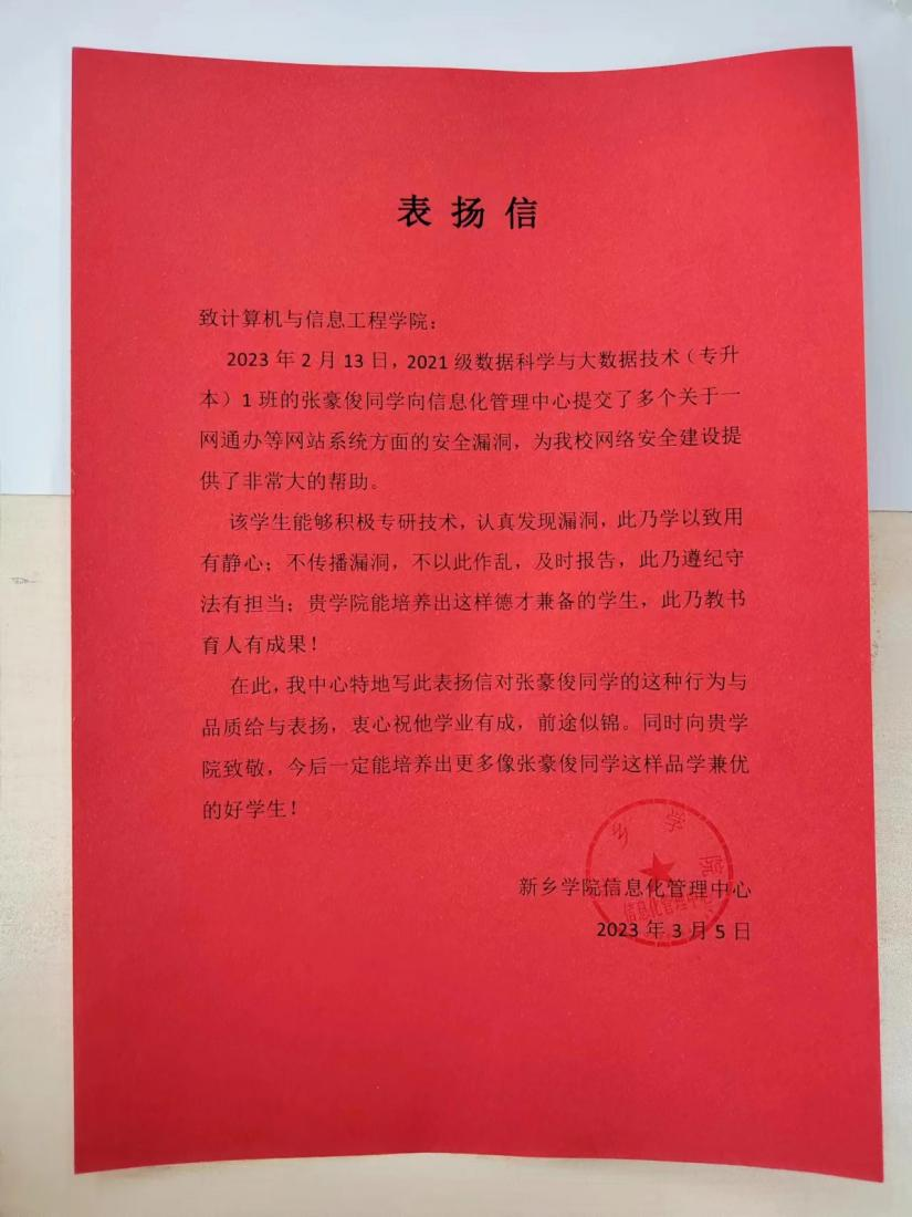 张豪俊是我院2021级数据科学与大数据技术(专升本)专业的学生,性格沉稳,为人正直,平时热爱看书,喜欢钻研技术,经常与其辅导员老师张兵交流心得。张豪俊发现学校网站漏洞后,立即记录详情并上报给张兵老师,然后在张老师的引领下来到信息化管理中心讲述详情,现场核查问题。信息化管理中心得到漏洞信息后,在相应工作负责人张鑫的指挥下迅速处置,立即对安全漏洞进行了封堵拦截,使相关网站风险降至最低,维护了学校的网络安全。据悉此次提交漏洞涉及一网通办等网站的多个系统。现漏洞修复完毕,信息化管理中心对张豪俊的行为和品质给予了充分认可和高度评价,并特地向我院送达了表扬信。